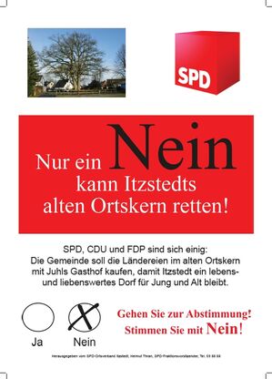 Herzlichen Dank an alle Itzstedter/innen, die sich am Bürgerentscheid beteiligt haben und ein ganz besonderer an die, die dem Mehrheitsbeschluss der Gemeindevertretung zum Kauf und Erhalt der Liegenschaften im alten Ortskern zugestimmt haben. Obwohl wir bei den Aktionen und Gesprächen im Vorfeld viel Zustimmung erfahren haben, haben die erfreulich hohe Wahlbeteiligung von 54 % und die breite Zustimmung von 63 % für unseren Beschluss unsere Erwartungen und Hoffnungen noch übertroffen.