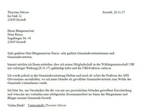 Der bisherige Gemeindevertreter der UBI Thorsten Stüwer hat gegenüber Bürgermeister Peter Reese und der Gemeindevertretung verkündet, dass er mit sofortiger Wirkung (28.11.2017) seine Mitgliedschaft in der Partei und der Fraktion beendet.